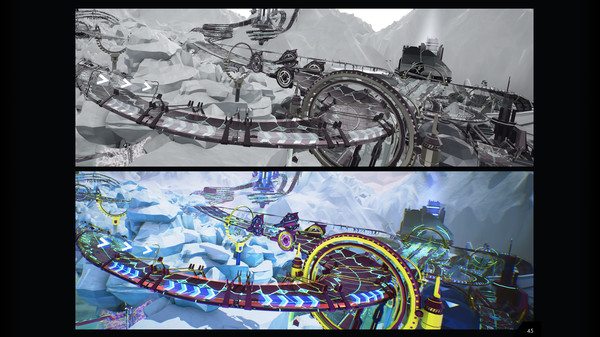 Find out more about the legendary Solar Redout Racing League; see the Redout beautiful landscapes as never before, with hundreds of preparatory sketches and unpublished concepts. Go explore in detail how the racetracks were assembled, and retrace the steps that determined their final in-game look; examine the Redout ships and see how they evolved from the initial prototypes. And finally, look under the hood and learn more about the shading tech behind Redout's distinct low-poly graphical style.
