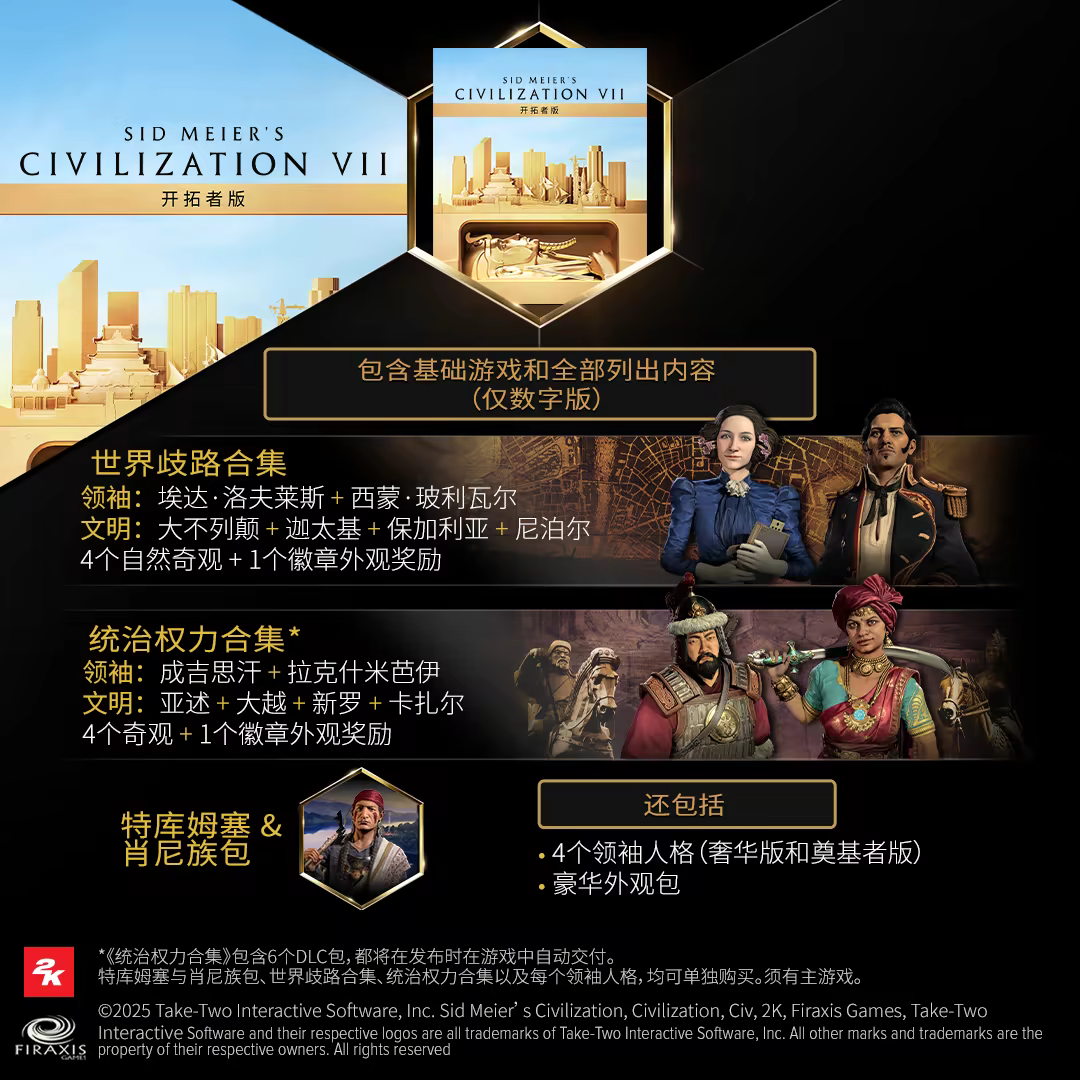 《席德·梅尔的文明VII》开拓者版是新玩家开启历史征程的理想选择,内含海量额外内容。如果你已拥有《席德·梅尔的文明VII》标准版或豪华版,可单独购买开拓者版包含的DLC。